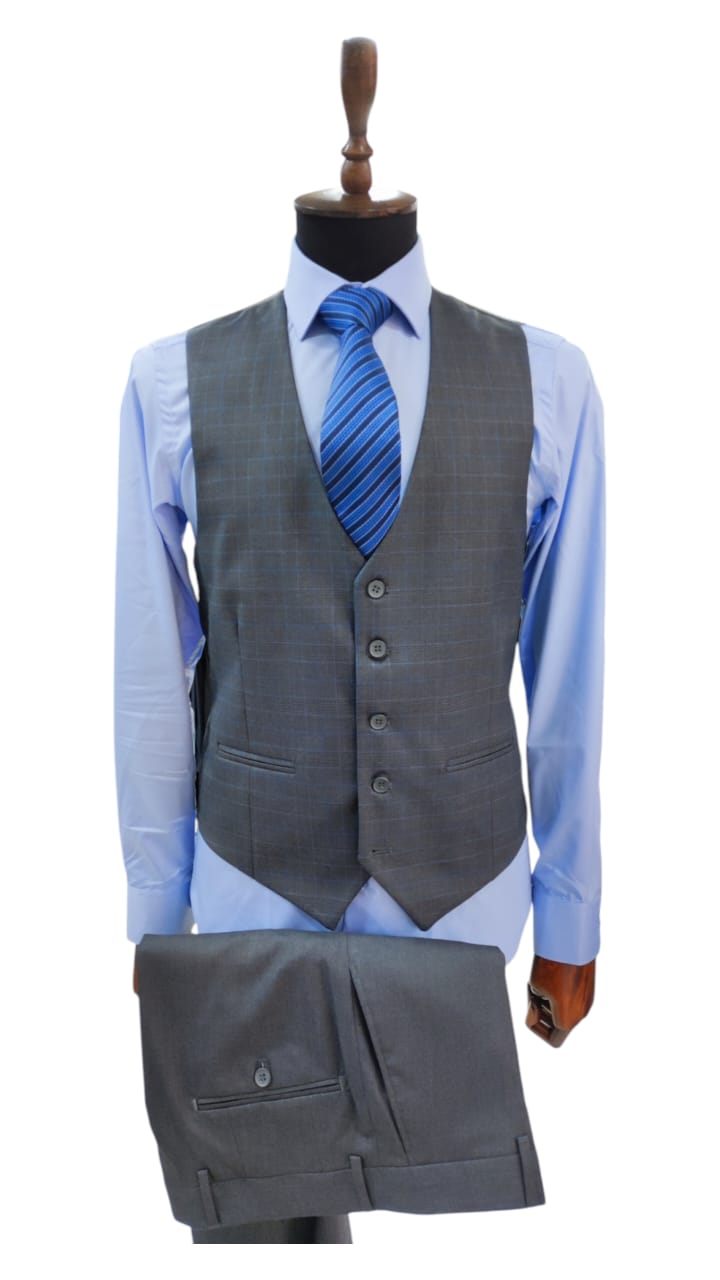 Costume Gris Foncé Avec gilet à Carreaux Bleu – 3 Pièces